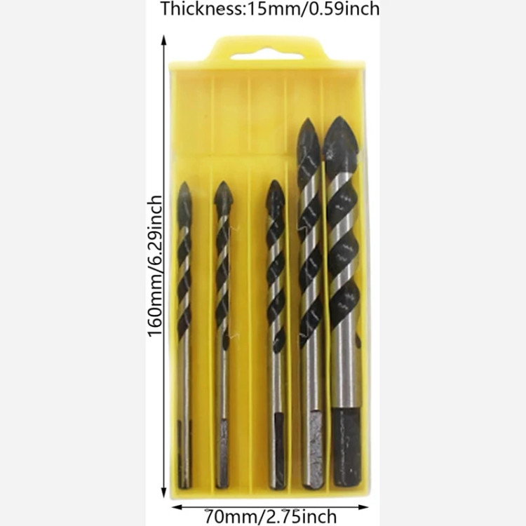 ست 5عددی مته نیزهای کارباید A1071 با نوک تنگستن کارباید و طراحی مارپیچ، مناسب برای سوراخکاری دقیق کاشی، سرامیک، شیشه، بتن سبک و آجر، با دوام و عمر طولانی.