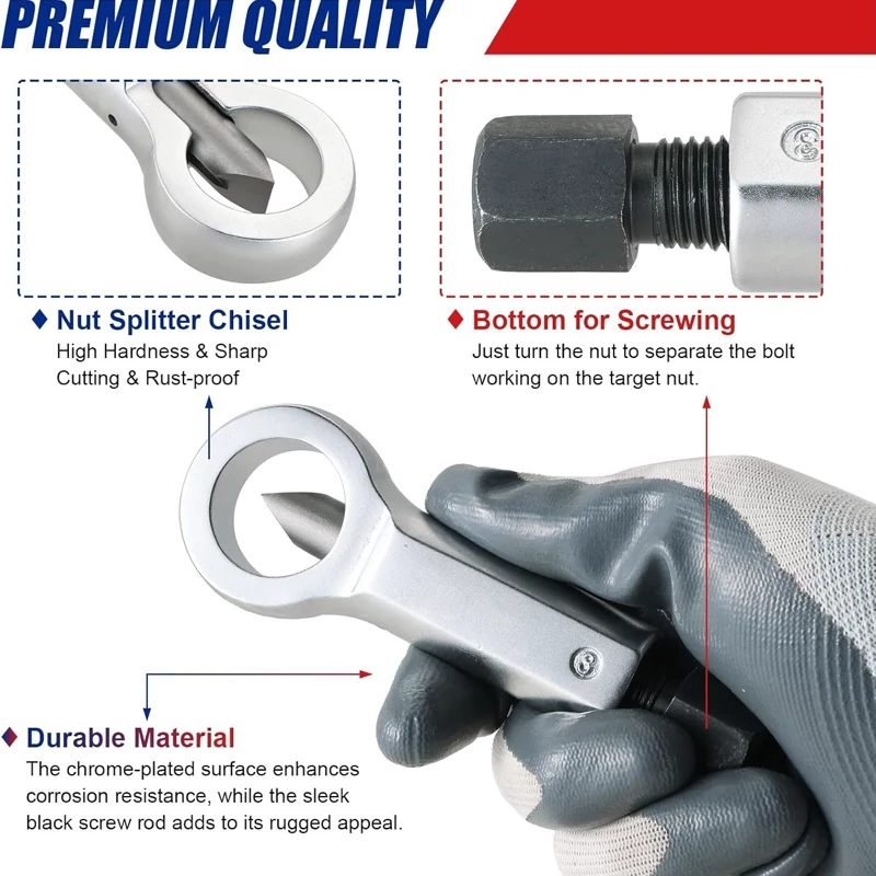 هر ابزار دارای تیغه داخلی برش است که با چرخاندن پیچ کناری، تیغه به داخل مهره فشار داده شده و آن را از وسط برش میدهد.