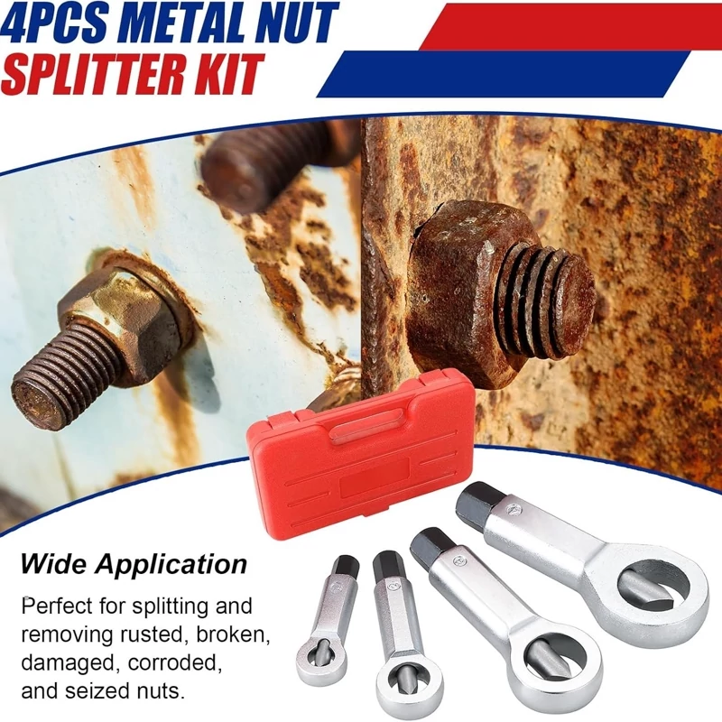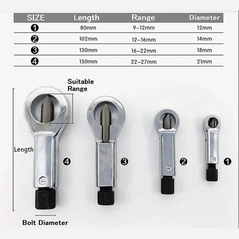 توضیح کامل محصول کیت مهرهشکن مدل A10170 از برند UTOOLS شامل چهار ابزار فلزی برای برش مهرههایی است که به دلیل زنگزدگی، فشار زیاد یا هرز شدن قابل بازکردن نیستند.