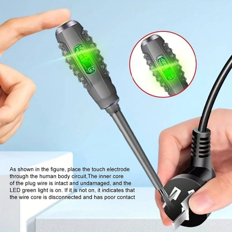 این دستگاه نیازی به تماس مستقیم با فلز ندارد و فقط با نزدیککردن نوک تستر به سیم یا پریز، وجود برق را با چراغ LED سبز رنگ نمایش میدهد.