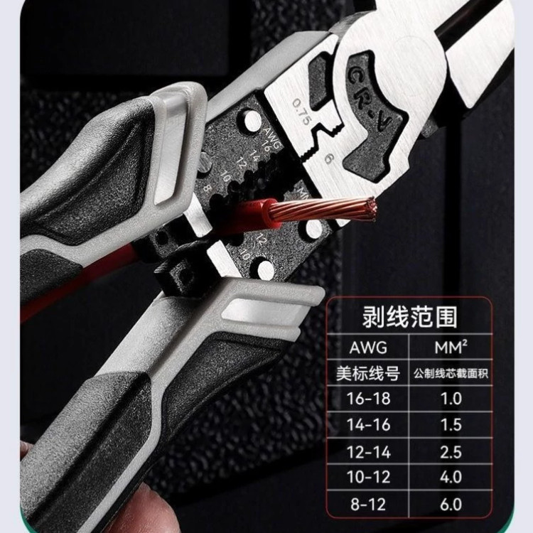 عملکرد لخت کردن سیم (Stripping): این انبردست مجهز به شیارهای کالیبرهشده برای لخت کردن دقیق سیمها است که گستره وسیعی از اندازهها، از 0.75mm2 تا 6.0mm2 (معادل AWG 16-18 تا AWG 8-12) را شامل میشود. این کالیبراسیون دقیق، تضمین میکند که عایق سیم بدون آسیب رساندن به مغزی سیمی، به سرعت جدا شود.