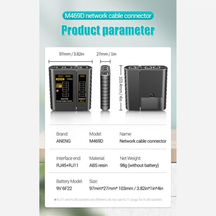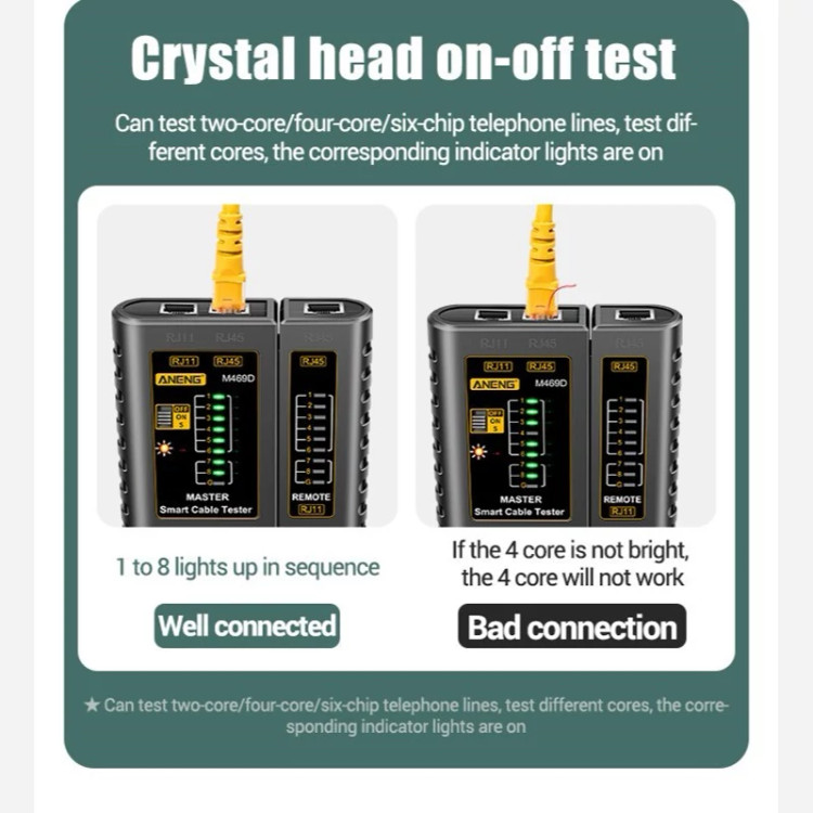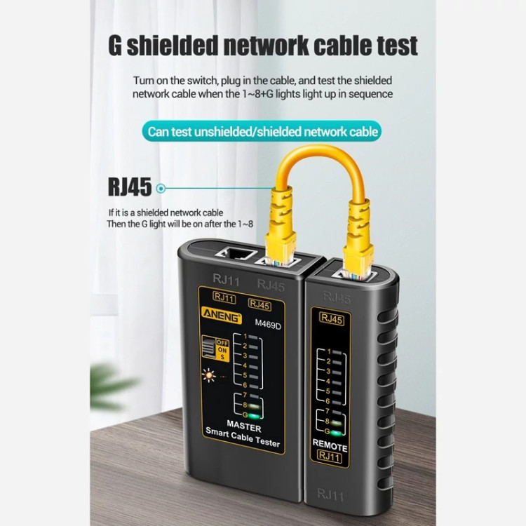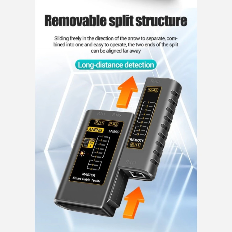 قابلیت جدا شدن دو بخش Master و Remote این تستر کابل شبکه و تلفن، به شما این امکان را میدهد که کابلهای نصب شده در دیوار یا کابلهایی با طول زیاد را به راحتی و توسط یک نفر تست کنید. نمایشگر LED روشن و خوانا، وضعیت اتصال هر 8 رشته سیم و همچنین وضعیت شیلد (G) را به صورت همزمان نمایش میدهد. با استفاده از تستر کابل ANENG، شما میتوانید به سرعت تشخیص دهید که آیا مشکل از کانکتور RJ45، سیمکشی RJ11، یا خود کابل است. طراحی ارگونومیک، وزن سبک (حدود 95 گرم) و بدنه مقاوم از جنس پلاستیک ABS، این ابزار را برای استفاده روزانه در محیطهای سخت کارگاهی و دیتاسنترها ایدهآل ساخته است.